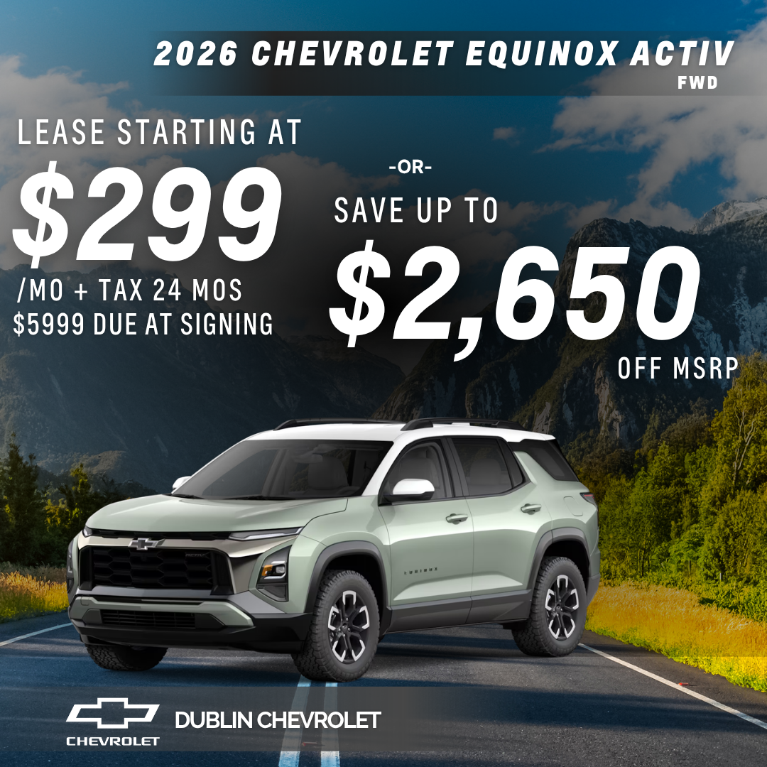 DISCLAIMER = Lease based on 2026 Chevrolet Equinox ACTIV FWD (TL413624/C50564). MSRP of $35,595 - $5,999 due at lease signing including $299 first monthly payment, $4,031.59 capitalized cost reduction, $695 acquisition fee, plus taxes, titles, license and documentary service fees. No security deposit required. Monthly payment Includes $1,000 current NON-GM vehicle lease in the household rebate (If not, $1,000 has to be put down to match the advertised payment). Option to purchase at lease end $23,786.70 Lessee is responsible for $.25 per mile over 10,000 miles year, excess wear, and a $395 termination fee. Offer Expires 04/30/2026.DISCLAIMER = Applies to 2026 Chevrolet Equinox ACTIV FWD (TL413624/C50564) in stock. Dealer Discount $2,650. Prices do not include government fees and taxes, any finance charge, any dealer document processing charge, any electronic filing charge and any emissions testing charge. Offer Expires 04/30/2026.